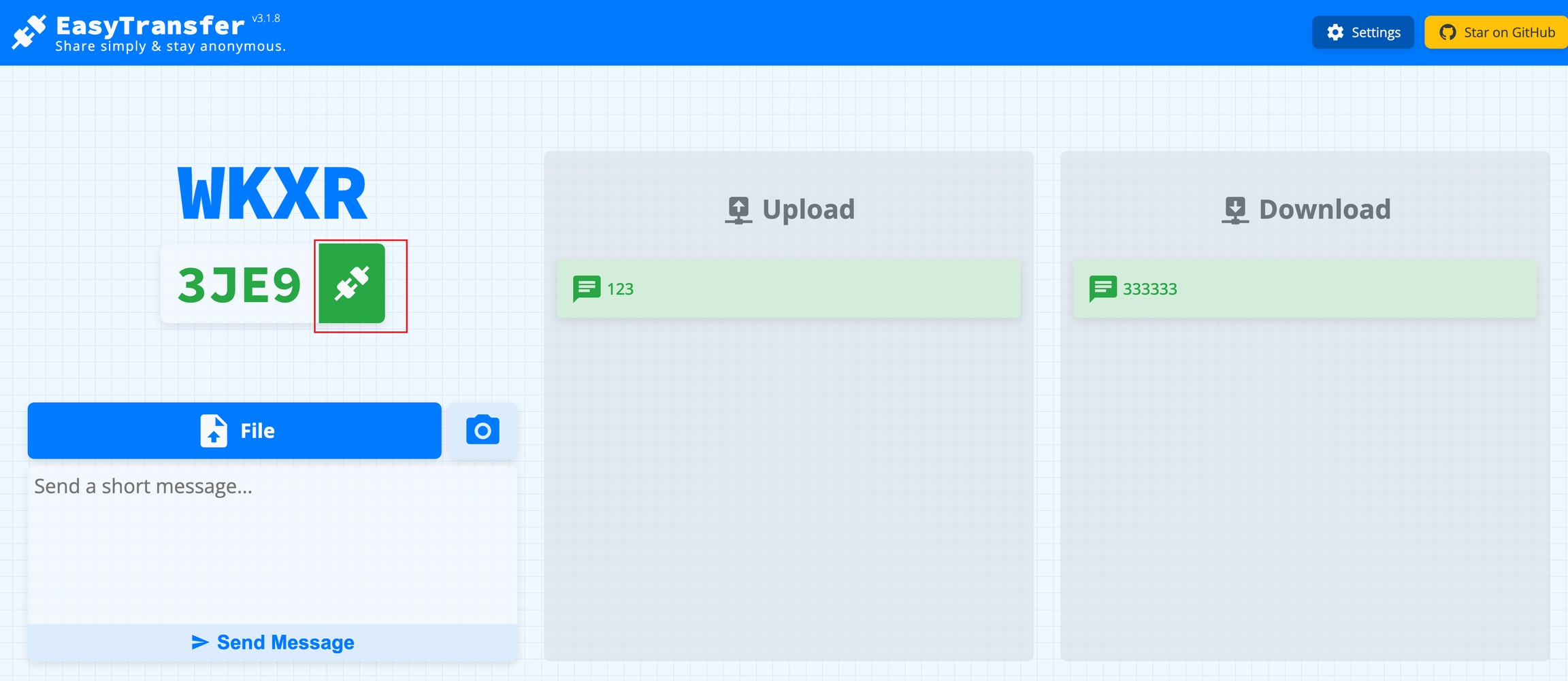 使用方法很简单,只要输入对方的 code 就好。如图 WKXR 就是当前自己的 code。我们需要输入的是对方的 code,然后点击输入框右边的链接即可。比如这里输入了 3JE9,就是和 code 为 3JE9 的客户端链接。
